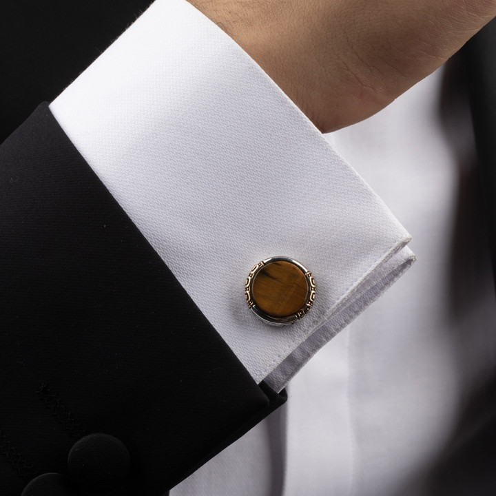 تمتع بإطلالة مميزة وأنيقة مع كبك رجالي فخم المصنوع من الفضة الاسترليني النقية عيار 925، مزين بحجر عين النمر الفاخر. يبرز هذا الكبك بالأناقة والحرفية العالية ليكون الاختيار المثالي للرجل المتميز في كل مناسبة.
