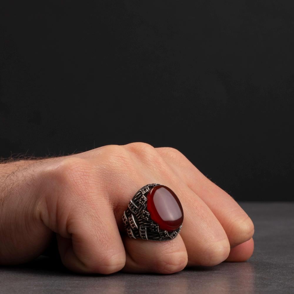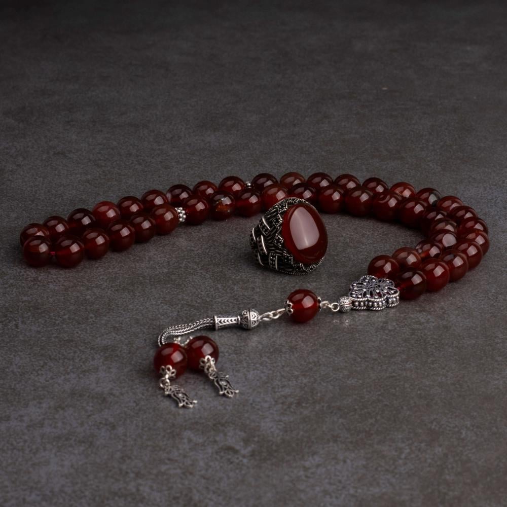• تصميم متناغم: يجمع هذا الطقم بين تألق حجر العقيق الأحمر في الخاتم ولمعان حبات العقيق الأحمر في السبحة، ليمنحك مظهرًا أنيقًا ومتكاملًا.