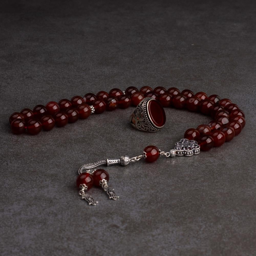 • جودة لا تضاهى: الخاتم مصنوع من الفضة الاسترليني عيار 925 بنقوش فاخرة، بينما تتميز السبحة بحبات عقيق طبيعي وشكة فضة أنيقة، مما يمنحك مزيجًا من الفخامة والصلابة.