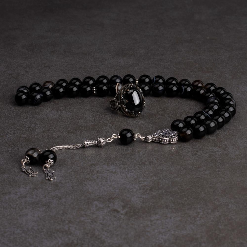سبحة عقيق أسود مع خاتم فضة أونيكس أسود – مزيج من القوة والفخامة