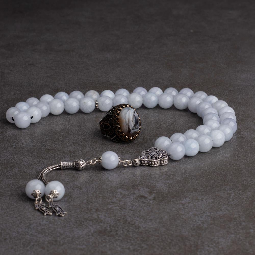 • جودة عالية تدوم طويلاً: الخاتم مصنوع من الفضة الاسترليني الخالصة عيار 925 لضمان المتانة واللمعان الدائم، بينما تتميز السبحة بحجر كوارتز لبني طبيعي مع شكة فضة راقية.