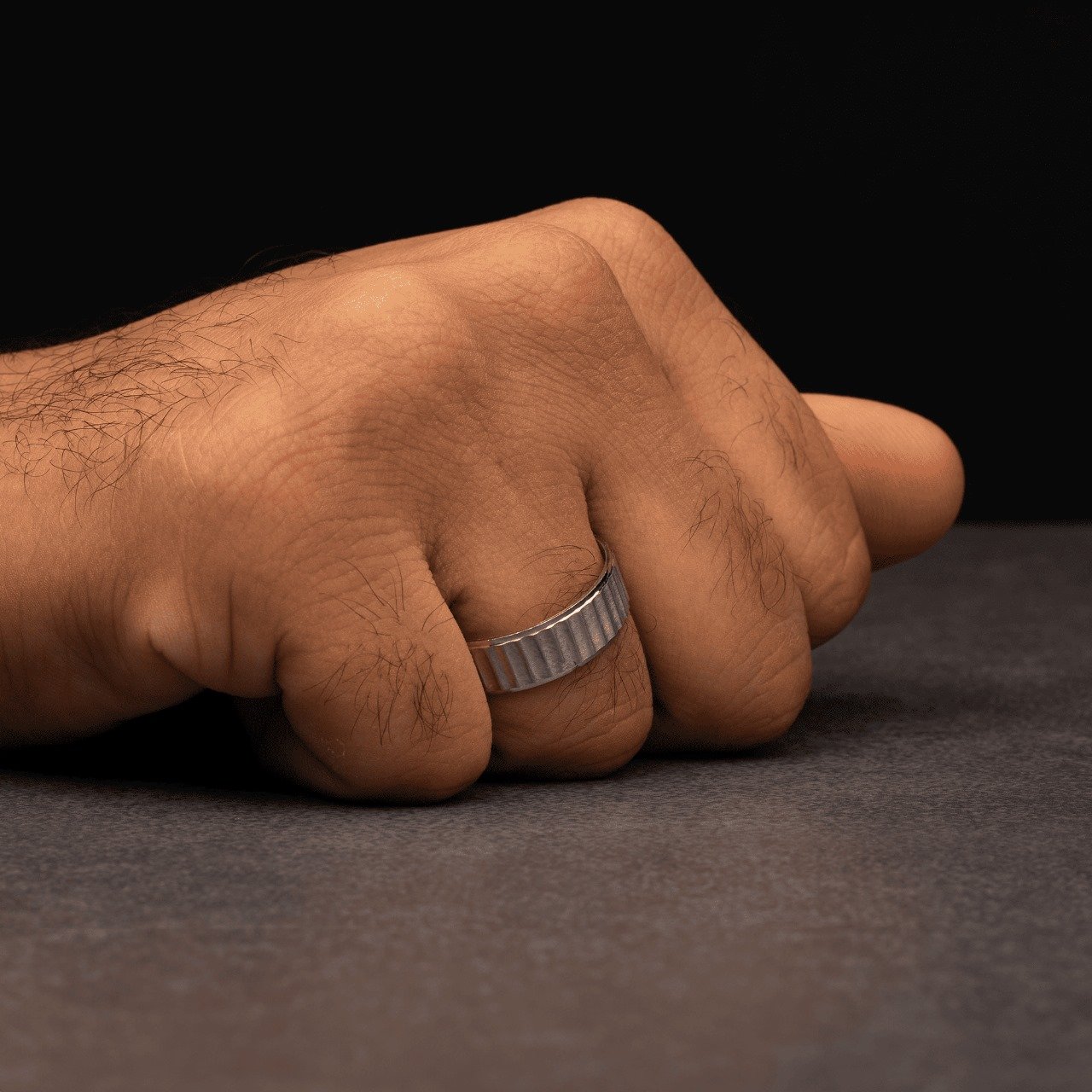 The ribbed ring design expresses strength and bold personality. If you are looking for a piece that reflects your distinct personality, this style of men's ring will add a touch of uniqueness to your look.