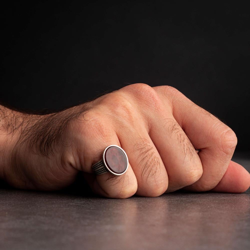 This men's silver agate ring features a unique design, as it shines with a red agate stone, adding a touch of elegance and charm to your look. The design of this ring reflects high craftsmanship and uniqueness, making it the perfect choice for those who love distinction.